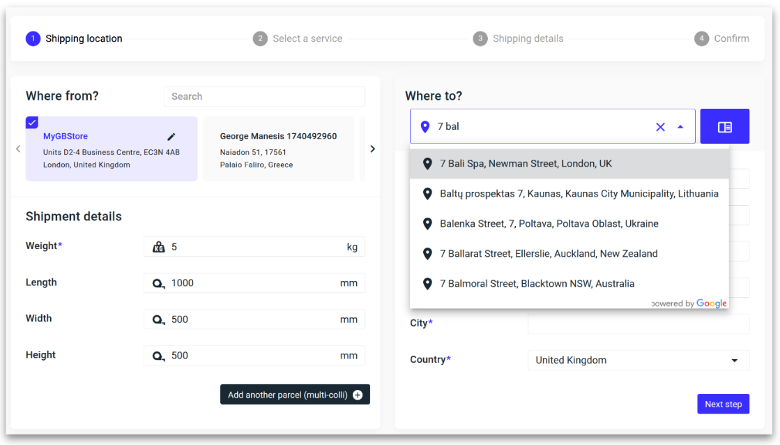Shipping location: Select shipper location, add weight and dimensions and add the receiver address.