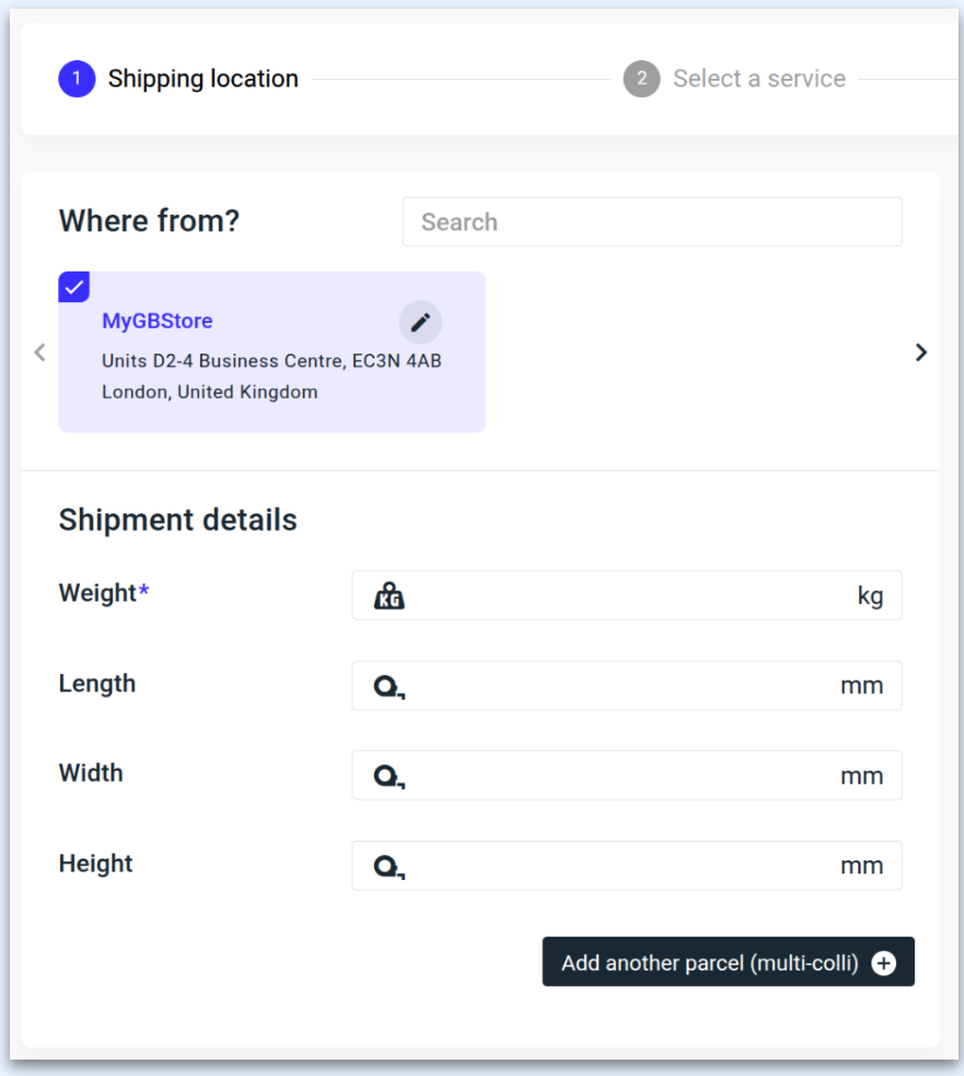 2. If you have multiple shops, select the correct one, then proceed to add the weight, dimensions.