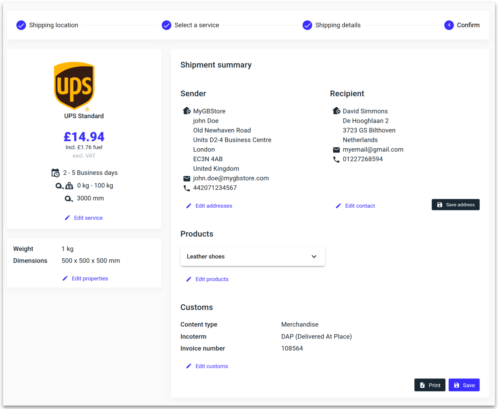 Check that all of the shipment details are correct, editing where necessary. Once you are satisfied with the information click ‘Save.’