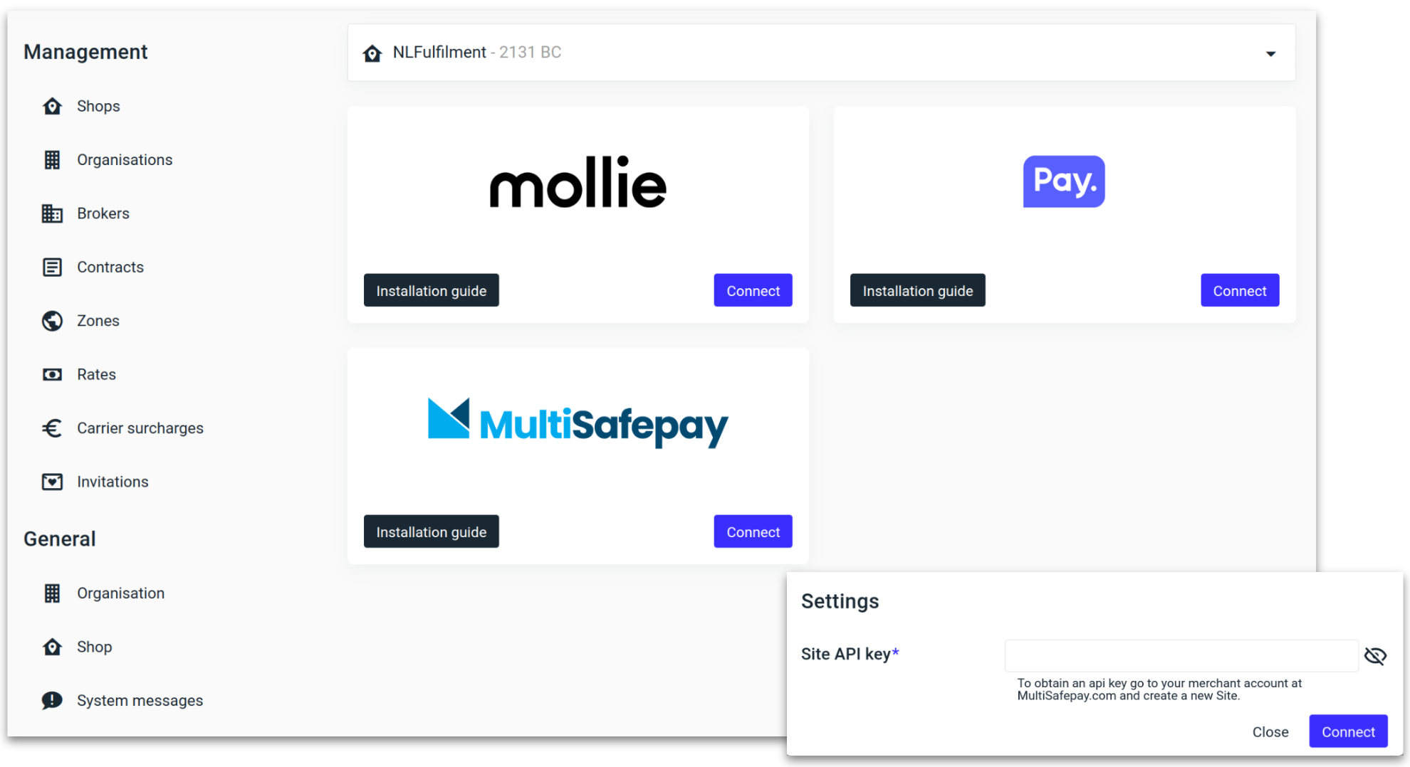 Add relevant payment methods to the new Site before connecting to MyParcel.com.