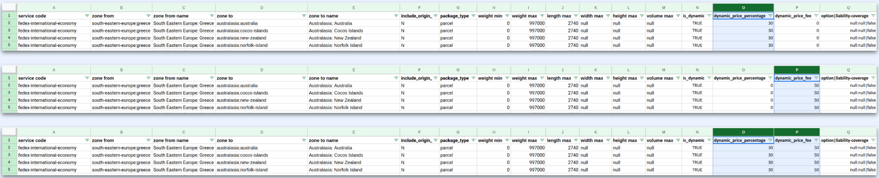 Some carriers offer real-time rate retrieval, known as dynamic rates. With dynamic rates, you only need to define the margin, flat fee, or both to apply to the rate returned by the carrier. By default, each row is one service.