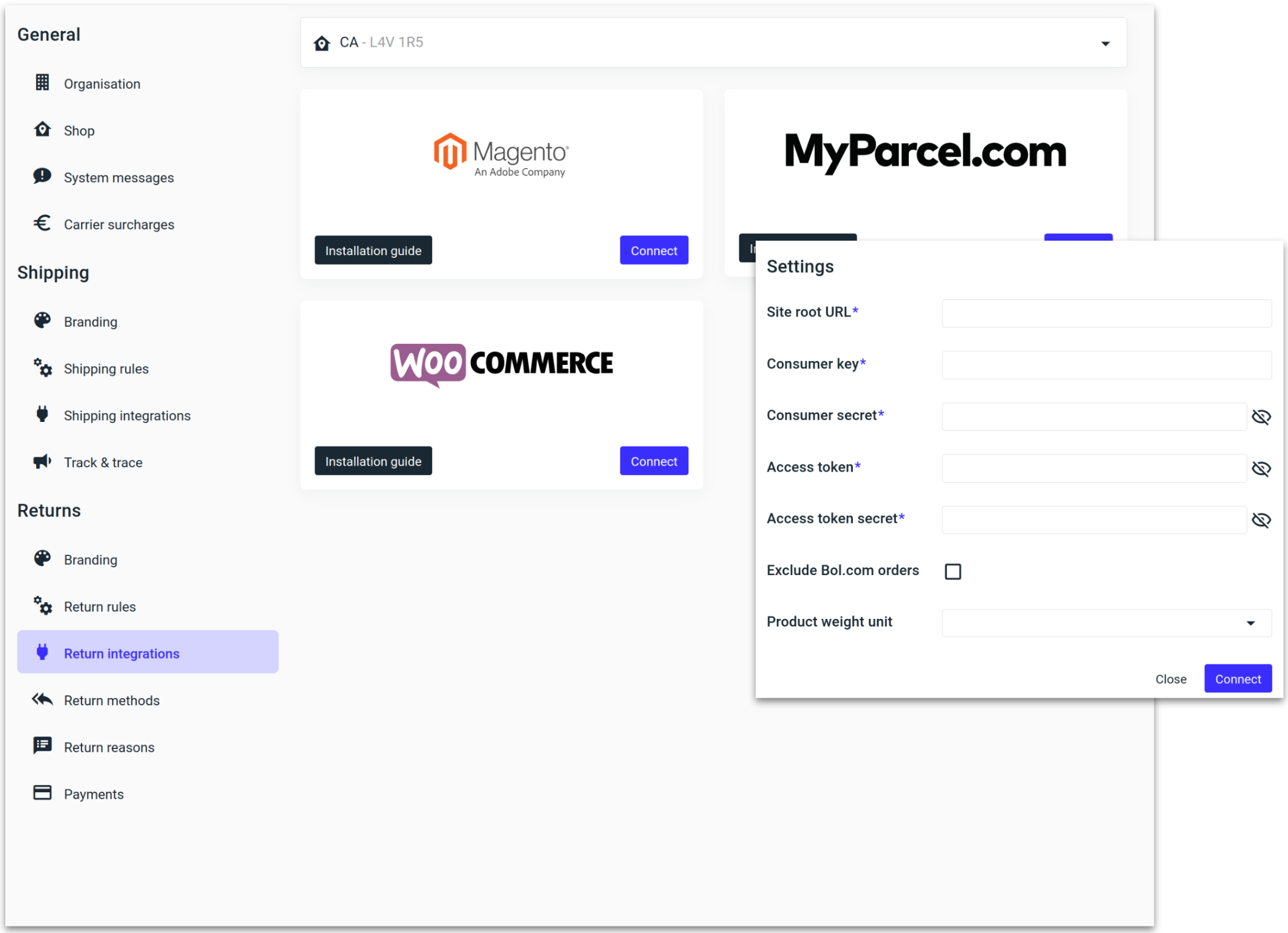 Navigate to the Return integration setting in MyParcel.com and under WooCommerce click “Connect”. Now paste the WooCommerce credentials into their respective fields and click “Connect”